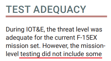 During IOT&E, the threat level was adequate for the current F-15EX mission set. However, the mission level testing did not include some advanced, longer-range threat weapons becoming operational at the time of F-15EX fielding.