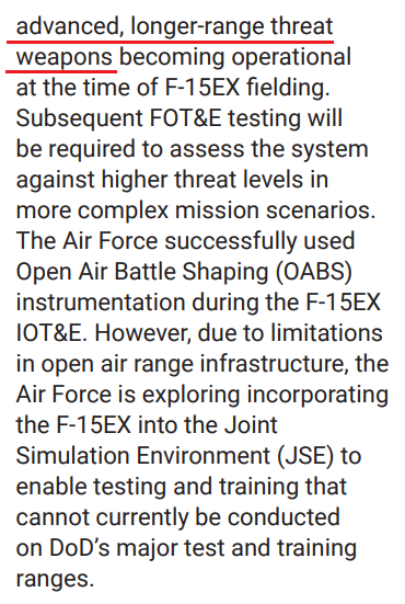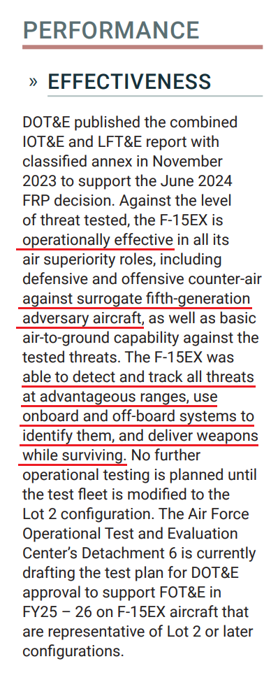 올해 1월에 나온 2024년 Director, Operational Test & Evaluation 보고서에 F-15EX가 'surrogate fifth-generation adversary aircraft'에 대해서도 operationally effective했다는 표현이 나오네요.