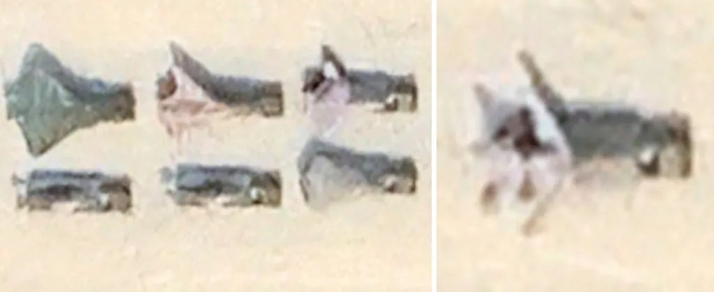 At left, a close-up showing four possibly tailless designs with modified diamond-like delta and cranked-kite wings in the June 11, 2025, image. At right, a close-up of the design that looks to have a more traditional wing and tail configuration. Google Earth