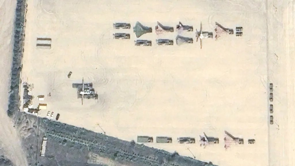 A Google Earth satellite image taken on June 11, 2025, shows the drones at a military base in Yangfang, a suburb northwest of the Chinese capital of Beijing. China’s People’s Liberation Army (PLA) regularly uses the facility to stage assets and train for large-scale parades.