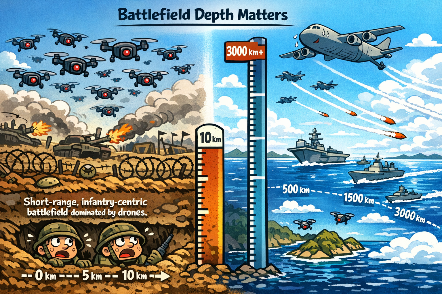 그러나 더 큰 문제는 우크라이나 전쟁이 인도·태평양 맥락에서 미국과 중국 군대에는 적용되지 않을 여러 특성을 지니고 있다는 점이다. 러시아의 지속적인 우크라이나 지상 침공으로 인해, 북쪽의 하르키우주에서 남쪽의 헤르손까지 600마일이 넘는 길이에 걸쳐 병력이 희박한 전선이 형성되었다. 어느 쪽도 제공권을 확보하지 못했기 때문에, 항공력은 다른 현대 분쟁들에 비해 훨씬 덜 중요해졌다. 러시아와 우크라이나의 기갑 부대와 기타 정예 부대들이 전쟁 초기 단계에서 치명적인 손실을 입은 이후, 어느 쪽도 2023년 중반 이후 대규모 제병협동 기동전을 수행하지 못했다. 그 결과 양군은 지뢰밭을 통과해 고정된 방어선을 시험적으로 공격하기 위해, 전차·포병·드론 지원이 결합된 소규모 보병 부대에 크게 의존할 수밖에 없었다. 진격은 양방향 모두에서 극도로 느리고 비용이 많이 들고 있다.