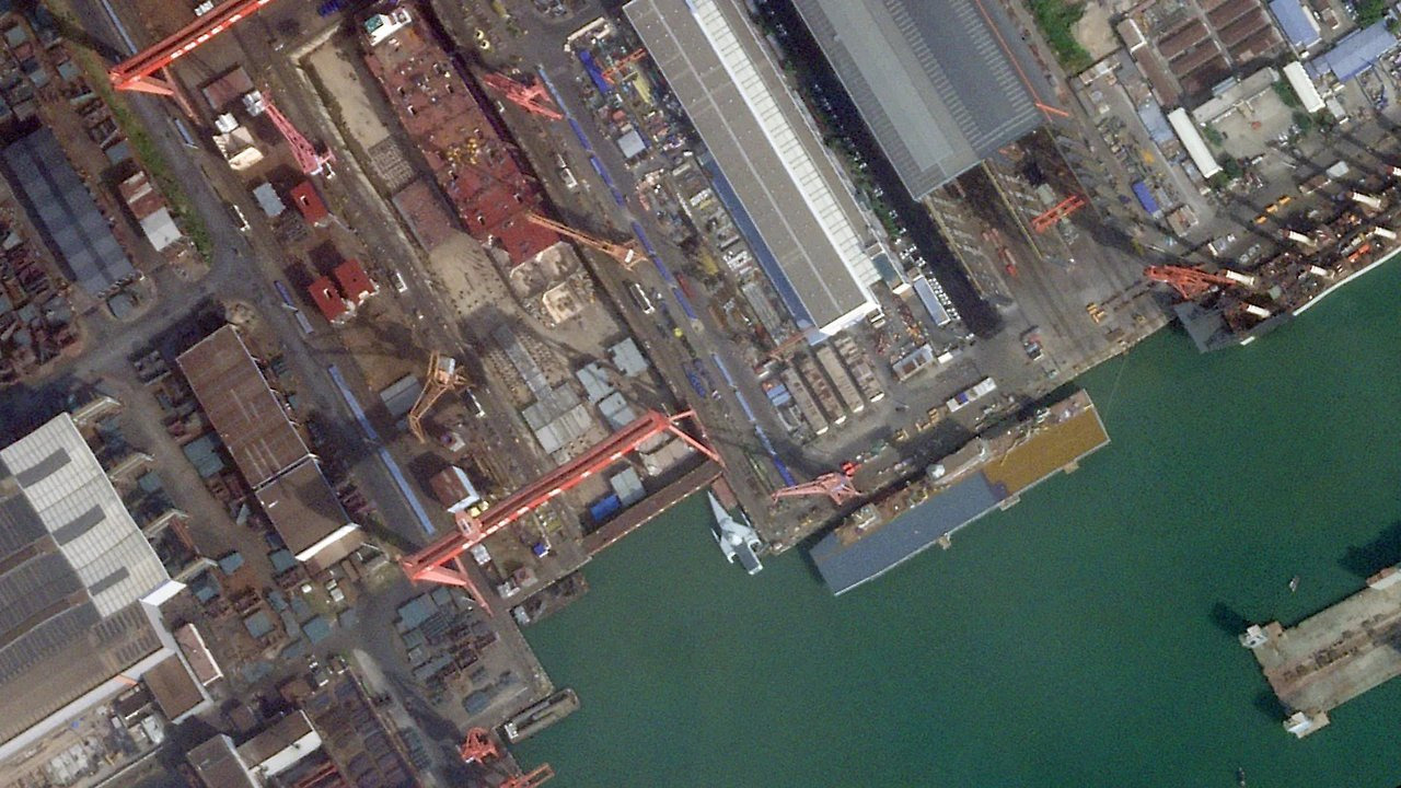 A satellite image of Guangzhou Shipyard International taken on October 23, 2024, showing, among others, the new class of Chinese aviation-capable ship. PHOTO © 2024 PLANET LABS INC. ALL RIGHTS RESERVED. REPRINTED BY PERMISSION