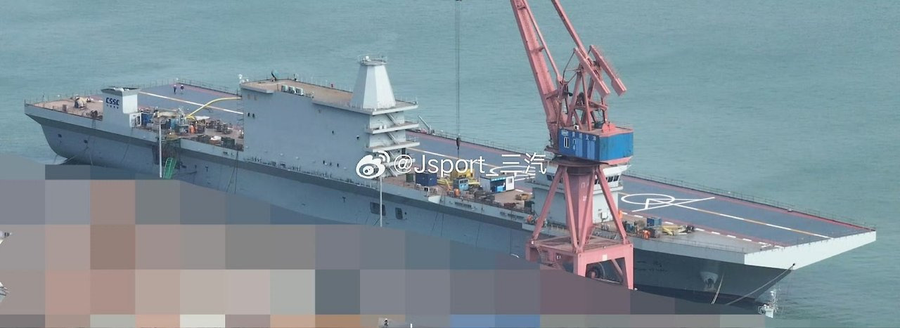 우현에 함교가 3개나 붙어 있는 중국의 평갑판형 함정이 최근 해상시험을 실시했네요. 회전익항공기나 드론 운영은 가능해 보이지만, 고정익기 운용을 위한 캐터펄트나 어레스팅 케이블은 없고, 웰덱도 보이지 않습니다.