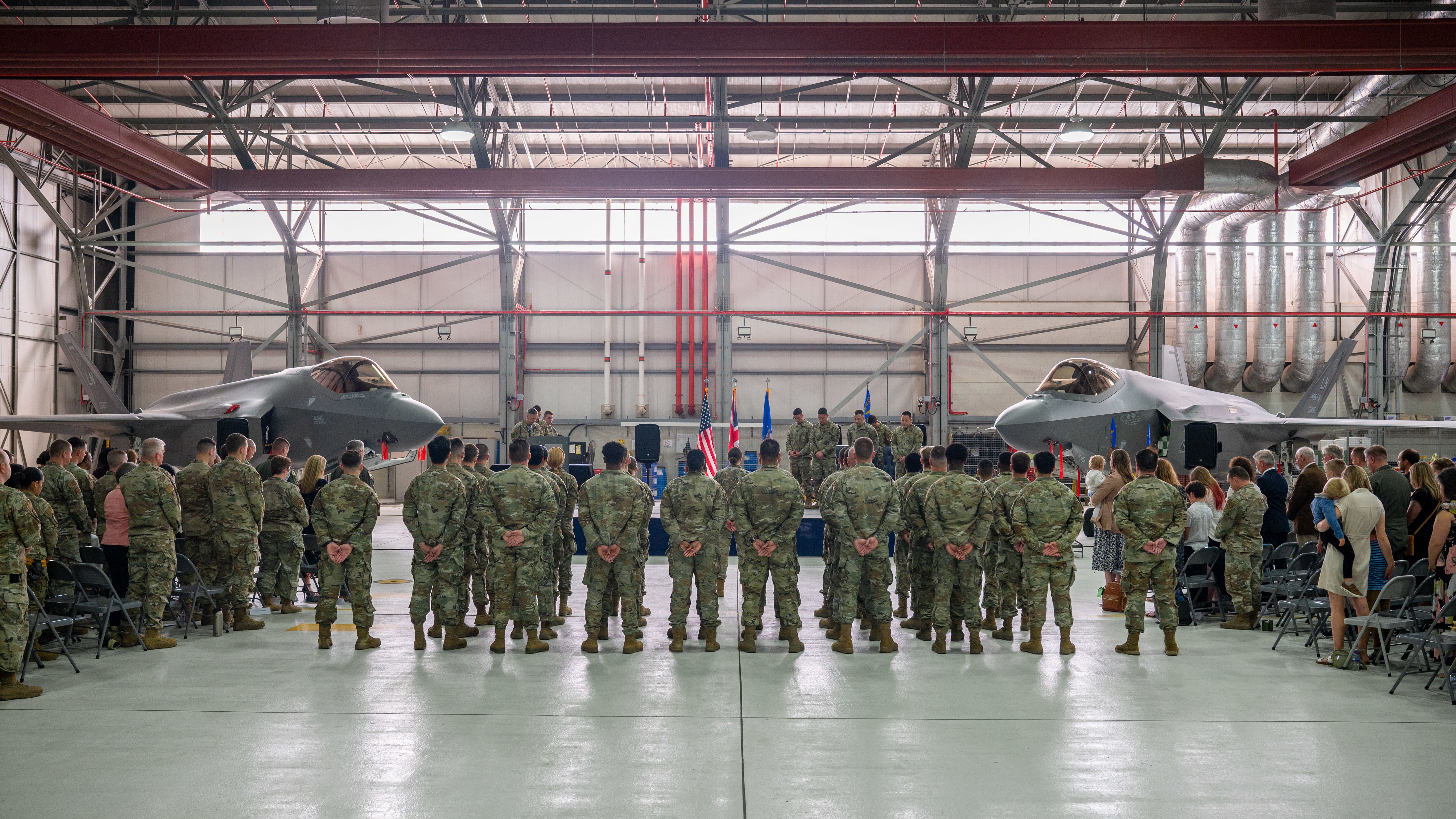 48th Wing airmen gather to attend the 748th Aircraft Maintenance Squadron deactivation ceremony and the activation and the assumption of command of the 493rd and 495th Fighter Generation Squadrons at RAF Lakenheath, June 9, 2023. U.S. Air Force photo by Airman 1st Class Seleena Muhammad-Ali Airman 1st Class Seleena Muhammad-Ali