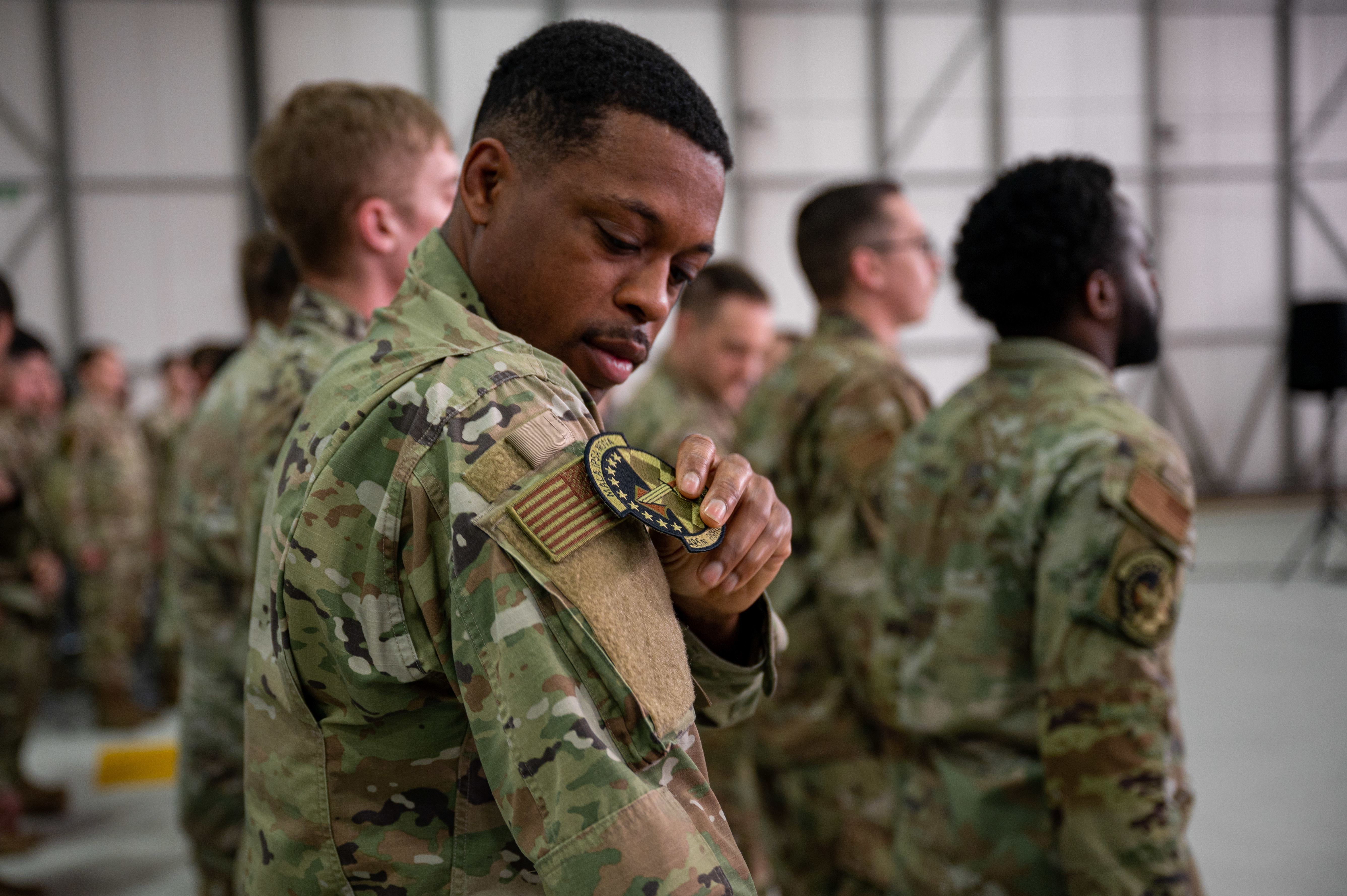 U.S. Air Force Omari Miller, 495th Fighter Generation Squadron F-35 avionics technician, replaces his 748th Aircraft Maintenance Squadron patch with the 495th Fighter Generation Squadron patch, signifying the deactivation and activation of the squadrons at RAF Lakenheath, June 9, 2023. U.S. Air Force photo by Airman 1st Class Seleena Muhammad-Ali Airman 1st Class Seleena Muhammad-Ali