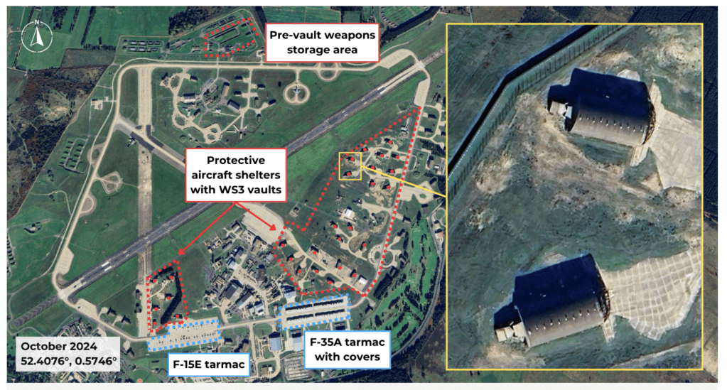 In the last few years, satellite imagery has confirmed upgrades being made to Lakenheath’s Protective Aircraft Shelters, which incorporate underground WS3 vaults for the storage of nuclear bombs. This work began in 2022, and, by early this year, around 28 of the 33 aircraft shelters had been upgraded, with construction continuing on six more.