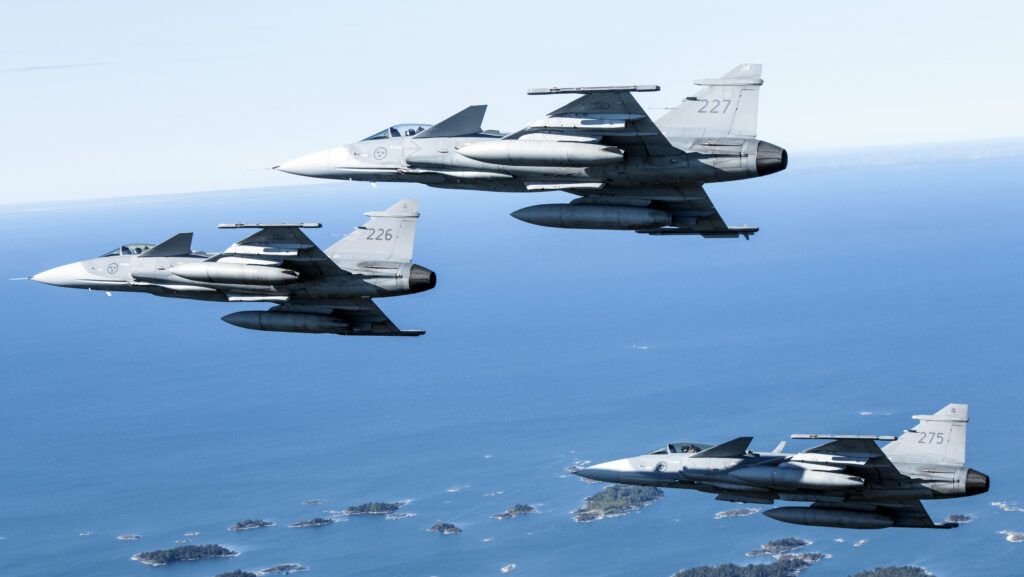 2020년 5월 20일, 스웨덴에서 장거리, 장시간 폭격 임무에 참가한 스웨덴군 Gripen 전투기 세 대. 동맹국 및 파트너들과의 작전과 교류는 우리가 전 세계 안보와 안정에 대한 공동의 의지를 강화하고 있음을 보여준다. (사진 제공: 스웨덴군)