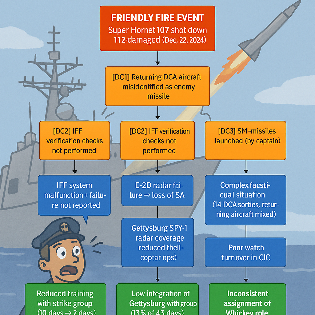 항모전단에 후티가 자폭드론 공격을 가하자, DCA 임무 수행을 위해 슈퍼호넷들이 여러 대 출격했고, 후티 타격을 지휘하던 공습지휘관이 DCA 중이던 호넷에 복귀를 지시했지만 전단 전체에 제대로 배포되지도 않았고 당직 교대 과정에서 IFF 오작동 사실이 인수인계되지 않아 DCA중인 호넷을 적 대함미사일로 판단하고 SM-2를 쐈다고 합니다.