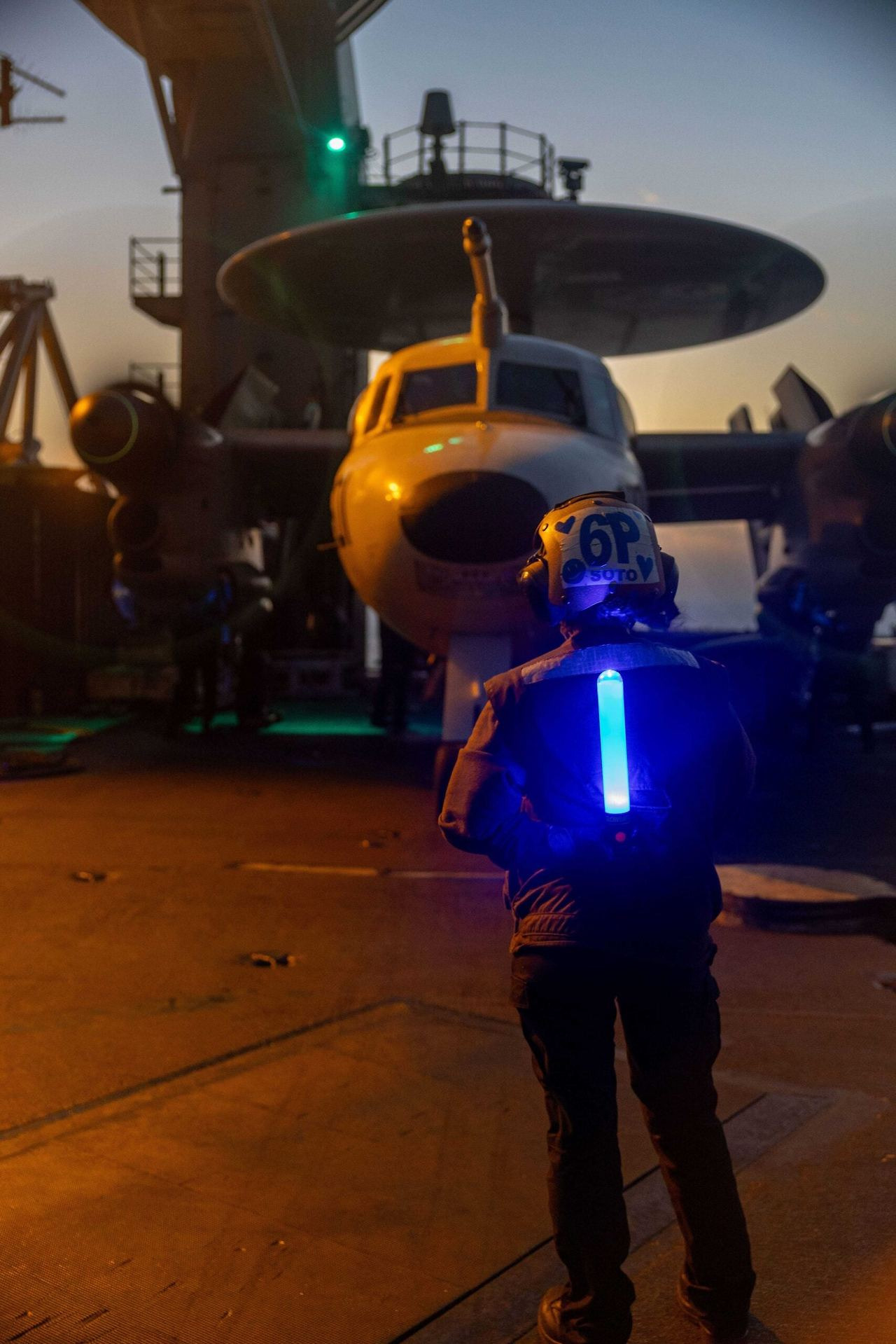 An Aviation Machinist’s Mate, assigned to Airborne Command and Control Squadron (VAW) 126, directs an E-2D Advanced Hawkeye on pre-flight checks on the flight deck of the Nimitz-class aircraft carrier USS Harry S. Truman (CVN-75) on March 28, 2025. US Navy Photo