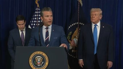 US President Donald Trump (right), at a briefing of the mission with Secretary of War Pete Hegseth (centre), and Secretary of State Marco Rubio (left). Credit: US State Department