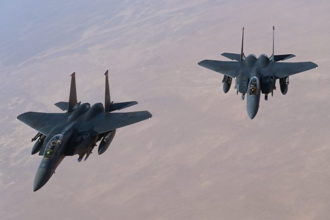 Two U.S. Air Force F-15E Strike Eagles conduct a combat air patrol in support of Operation Inherent Resolve over the U.S. Central Command area of responsibility Nov. 23, 2024. U.S. Air Force photo