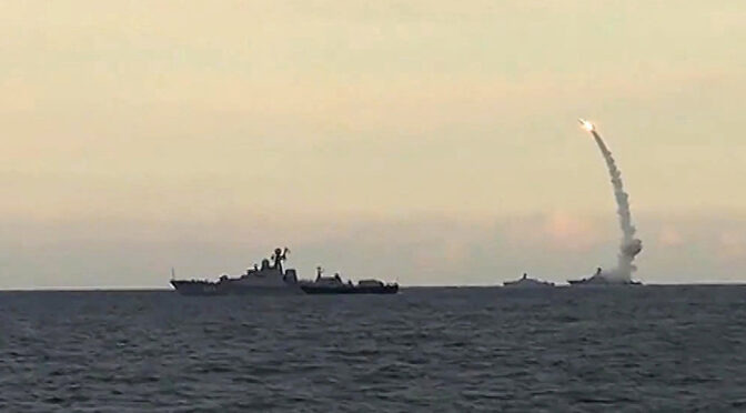 Featured Image: A Russian Navy Caspian Flotilla warship fires a Kalibr-NK cruise missile during naval drills. (Photo via Russian Ministry of Defense)