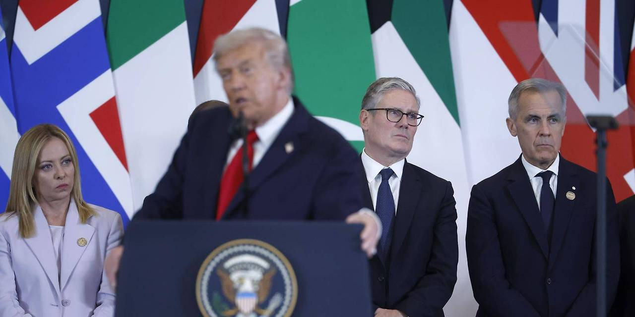 이미지 — 2025년 10월 샤름 엘 셰이크 정상회의에서 연설하는 도널드 트럼프 대통령과 이를 듣고 있는 이탈리아 총리 조르자 멜로니, 영국 총리 키어 스타머, 캐나다 총리 마크 카니. (칩 소모데빌라/게티이미지)