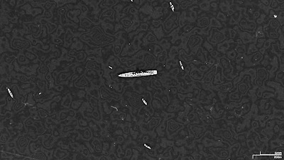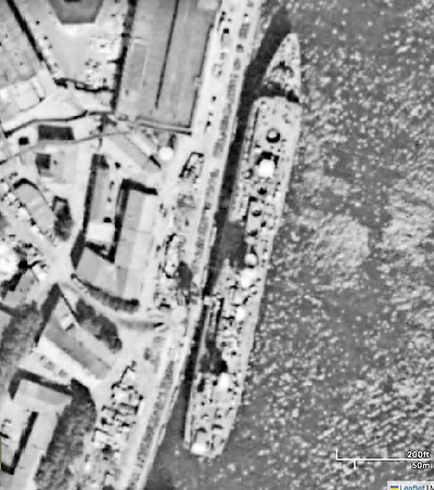 After focusing on the Kirov, over the next several years American satellites continued to photograph the shipyard at Leningrad and by the latter half of 1978 they revealed the construction of a second ship similar to Kirov. In July 1980, HEXAGON mission 1216 photographed a large ship with the same hull dimensions as Kirov under assembly. But the HEXAGON’s ability to photograph large amounts of territory in a single image meant that not only did it photograph the new ship—eventually named Frunze—but also the Kirov, moored in the Bay of Finland. The Soviet battlecruiser was surrounded by a fleet of small security ships, indicating that he (Soviet warships were referred to as “he” in Russian) was now undergoing sea trials. In October, the Kirov was spotted by NATO patrol planes north of the Norwegian coast. They photographed it as well, and photos of the large warship were finally publicly released.[3]
