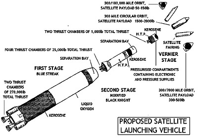 However, Blue Streak development continued, with it now under consideration as the first stage for some as-yet unidentified civilian launch vehicle. This was presumably an effort by the government to gain some benefit from the roughly £70 million [6, p. 121] spent on it up to that point. The various proposed launch vehicles will now be discussed.