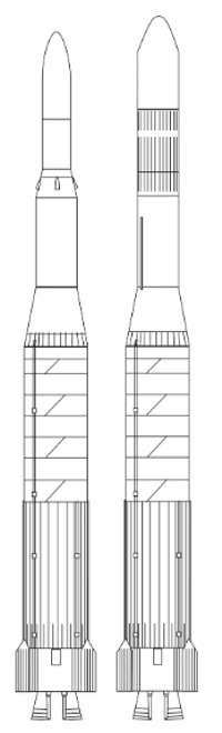 As the Europa program came to an end, Hawker Siddeley Dynamics (the successor company to de Havilland Propellers) made a last-ditch effort to keep Blue Streak in production by carrying out a study that examined combining it with an American Centaur second stage [5, pp. 199-201]. This made some technical sense, as by this point both Blue Streak and Centaur were reliable, flight-tested vehicles; in particular, Centaur was past its early development problems [12]. In addition, Blue Streak, like Atlas and Centaur, had a 10-foot (3-meter) diameter stainless steel structure and partially shared their pressure-stabilized design [4]. A Blue Streak-Centaur would therefore resemble a somewhat truncated Atlas-Centaur, given the 70-foot (21.3-meter) length of Blue Streak versus the 85-foot (25.9-meter) length of the Atlas. (This reduced size reflects the fact that Blue Streak was an intermediate range missile, while the Atlas was intercontinental.) Since a Centaur would be approaching the maximum upper stage mass feasible with Blue Streak, the study also included the optional addition of a pair of French Nord Aviation L17 liquid propellant boosters (derived from the Diamant launch vehicle). Launch would be from Kourou.