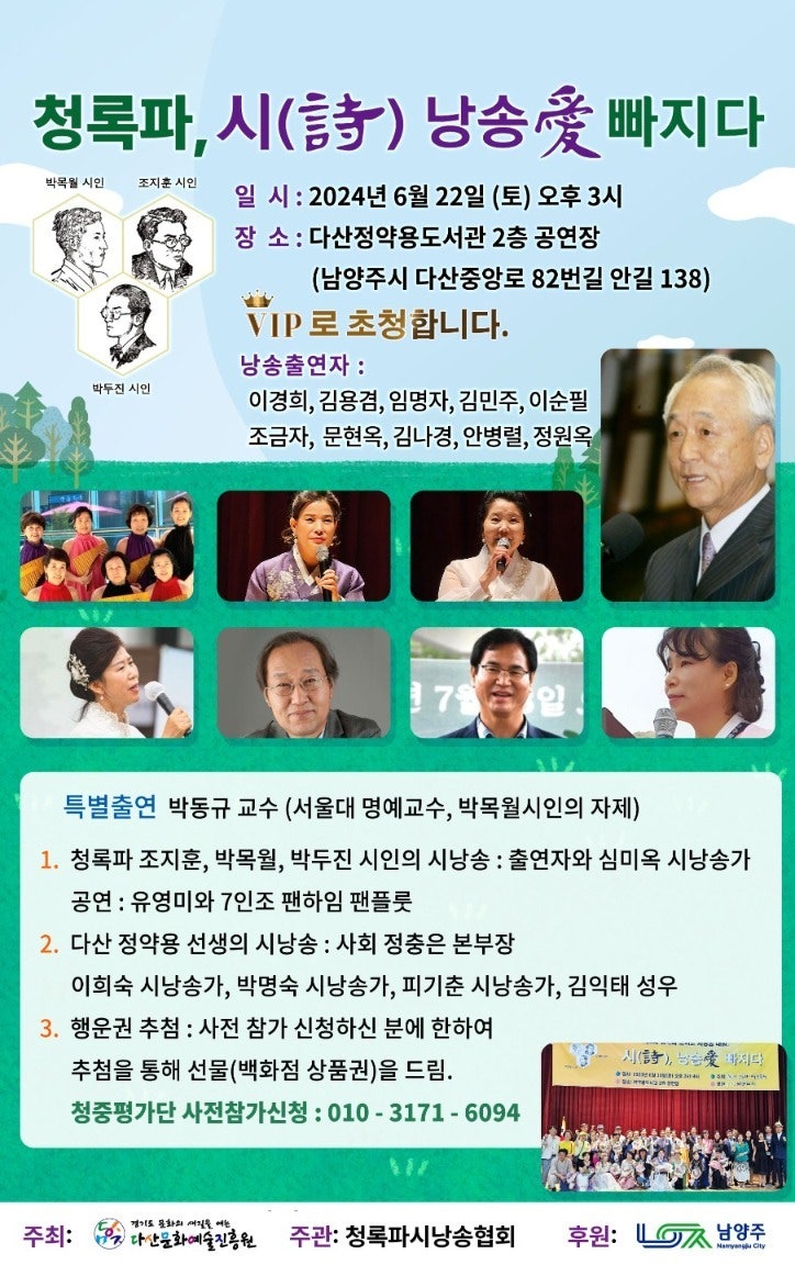 청록파 시낭송 애 빠지다. 다산문화예술진흥원 작성자이효상원장|작성시간24.06.07|조회수6 목록 댓글 0 글자크기 작게가 글자크기 크게가 청록파시낭송 에 빠지다. 6월 22일(토) VIP로 초청합니다. 다산문화예술진흥원 다음검색 현재 게시글 추가 기능 열기 북마크 공유하기 신고 센터로 신고 댓글 댓글 0 댓글쓰기 답글쓰기 댓글 리스트