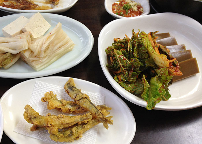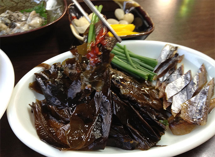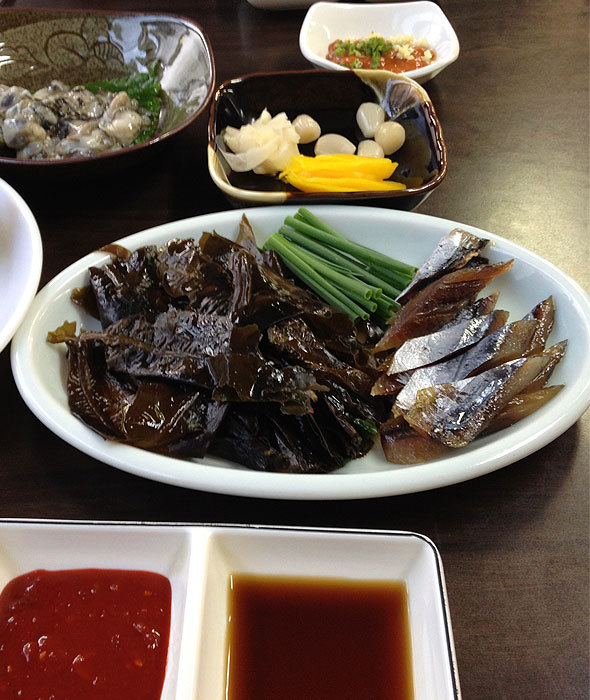 과메기,굴, 매생이죽, 양념꼬막, 빙어튀김, 도토리묵,두부김치,생선구이 등이 차례대로