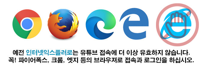 이제는 인터넷 익스플로러는 보안업데이트 지원이 종료되었기 때문에 대부분의 싸이트에서 접속 거부 현상이 나타납니다. 유튜브 같은 곳은 로그인에도 문제가 있고, 로그인이 되었다하더라도 댓글 작성이 안 됩니다. 보안에 취약하기 때문에 대부분의 웹페이지에서 인터넷익스플로러를 거부합니다.
