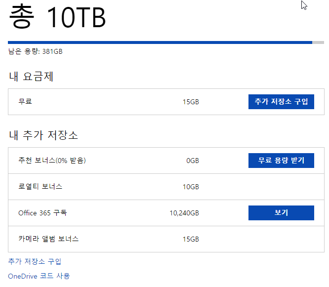 Office365 구독을 하면 처음에 1TB가 주어지며, 별도로 신청하면 10TB까지 확대됩니다.