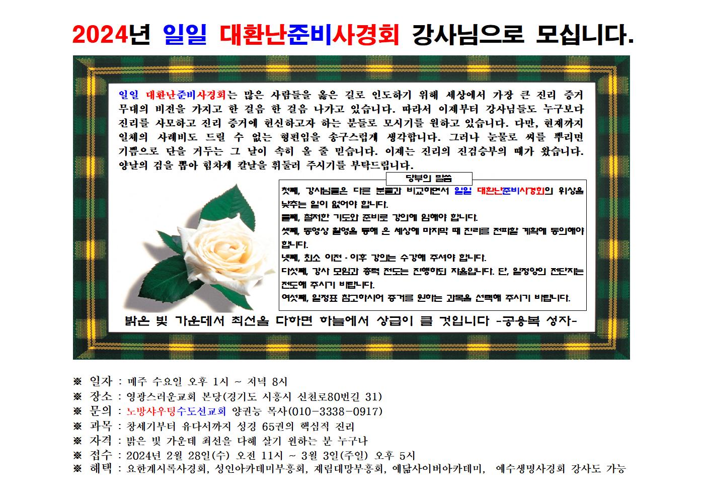 2024년 일일 대환난준비사경회 강사님으로 모십니다. 작성자밑거름|작성시간24.02.28|조회수5 목록 댓글 0 글자크기 작게가 글자크기 크게가 다음검색 현재 게시글 추가 기능 열기 북마크 공유하기 신고 센터로 신고 댓글 댓글 0 댓글쓰기 답글쓰기 댓글 리스트