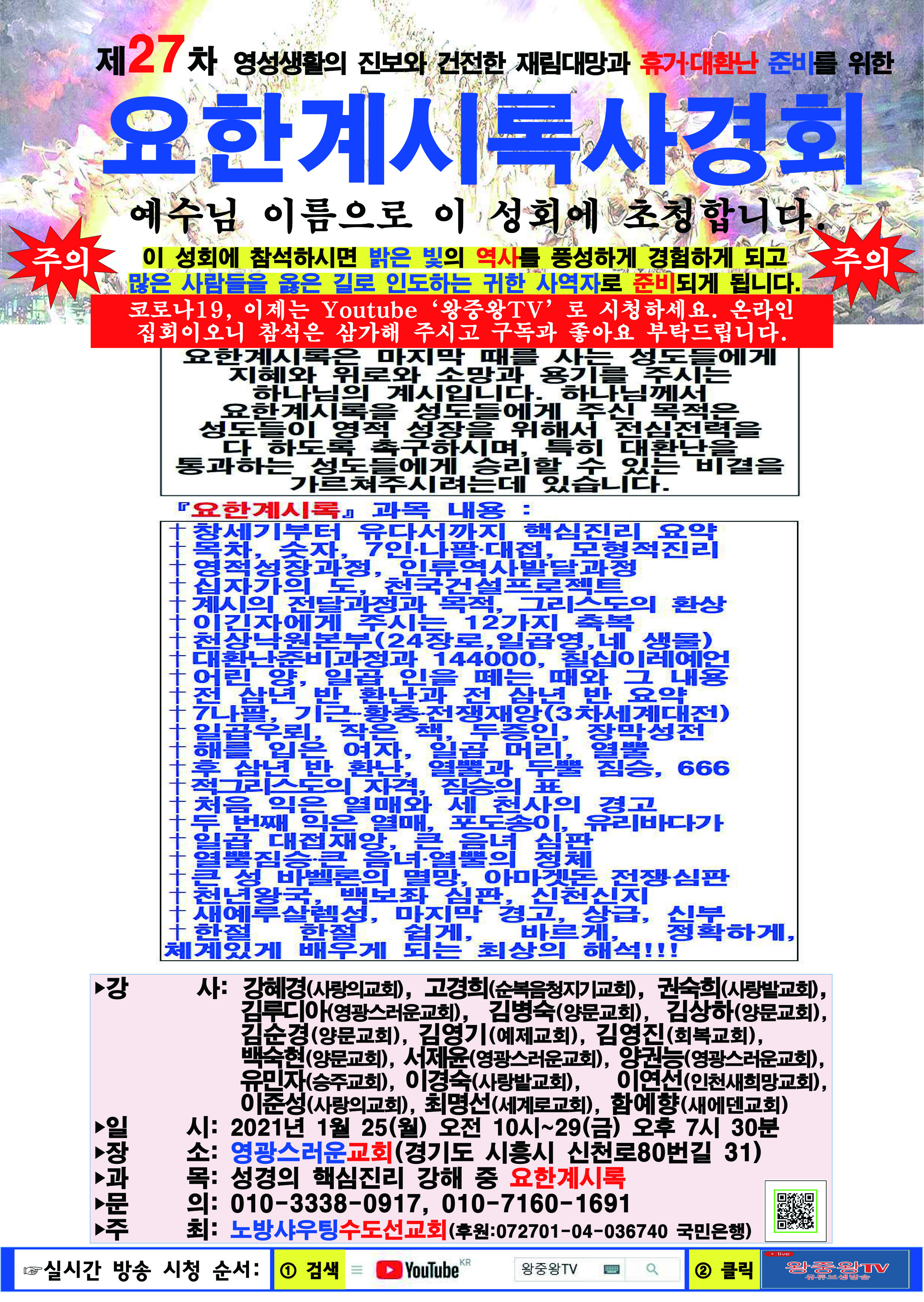 제27차 요한계시록사경회 안내 작성자밑거름|작성시간21.01.22|조회수21 목록 댓글 0 글자크기 작게가 글자크기 크게가 다음검색 현재 게시글 추가 기능 열기 북마크 공유하기 신고 센터로 신고 댓글 댓글 0 댓글쓰기 답글쓰기 댓글 리스트