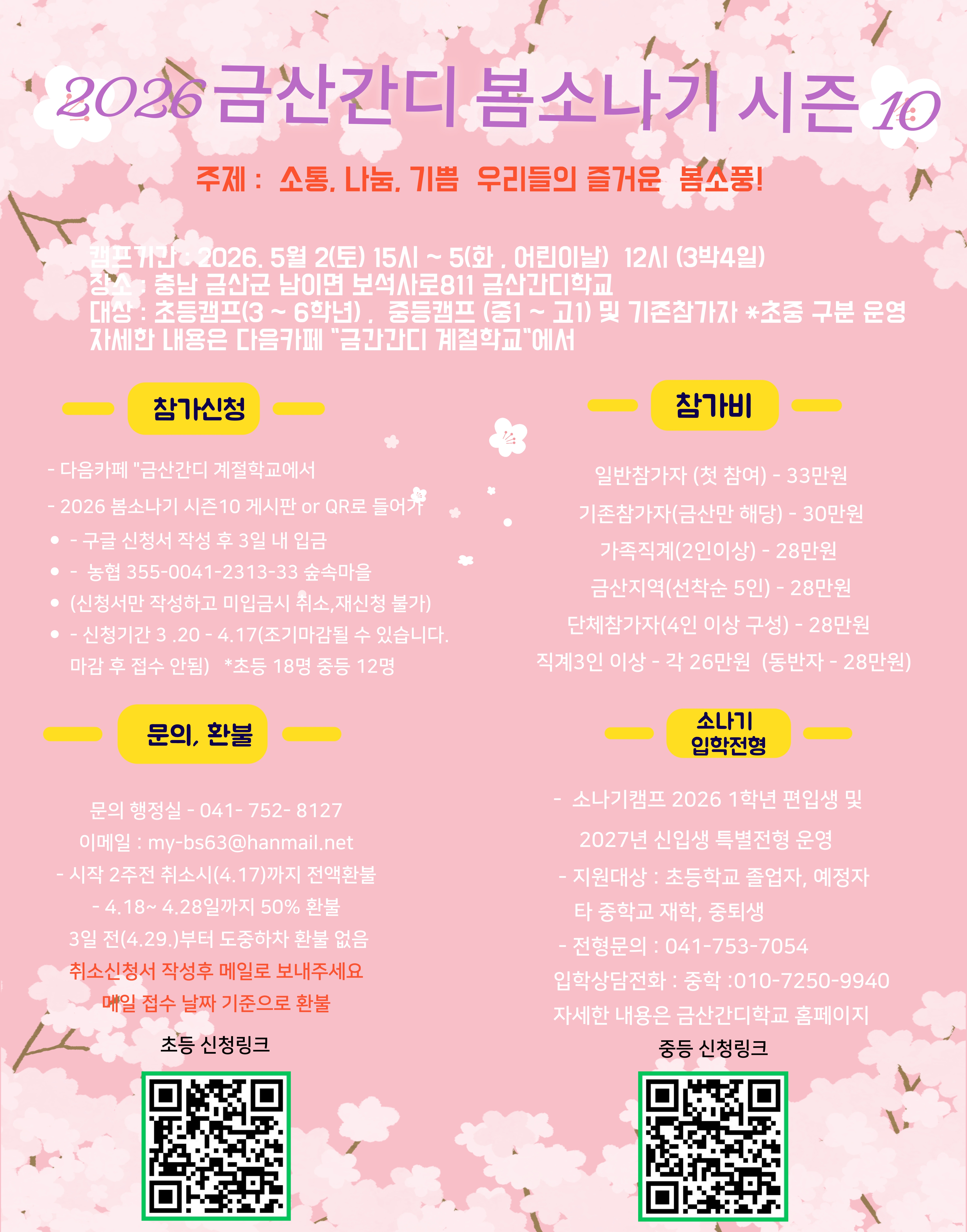 환불규정 - 계절학교 시작 2주일(4.17일까지) 전에는 전액 환불해드립니다.