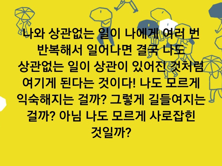 나와 상관없는 일이 나에게 여러 번 반복해서 일어나면 결국 나도 상관없는 일이 상관이 있어진 것처럼 여기게 된다는 것이다! 나도 모르게 익숙해지는 걸까? 그렇게 길들여지는 걸까? 아님 나도 모르게 사로잡힌 것일까?