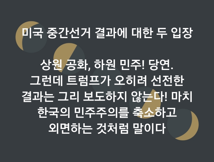 미국 중간선거 결과에 대한 두 입장 작성자우태닝|작성시간18.11.08|조회수29 목록 댓글 0 글자크기 작게가 글자크기 크게가 미국 중간선거 결과에 대한 두 입장상원 공화, 하원 민주! 당연.그런데 트럼프가 오히려 선전한 결과는 그리 보도하지 않는다! 마치 한국의 민주주의를 축소하고 외면하는 것처럼 말이다 다음검색 현재 게시글 추가 기능 열기 북마크 공유하기 신고 센터로 신고 댓글 댓글 0 댓글쓰기 답글쓰기 댓글 리스트