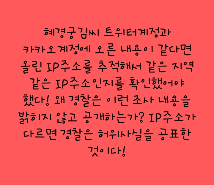 혜경궁김씨 트위터계정과 카카오계정에 오른 내용이 같다면 올린 IP주소를 추적해서 같은 지역 같은 IP주소인지를 확인했어야 했다! 왜 경찰은 이런 조사 내용을 밝히지 않고 공개하는가? IP주소가 다르면 경찰은 허위사실을 공표한 것이다!
