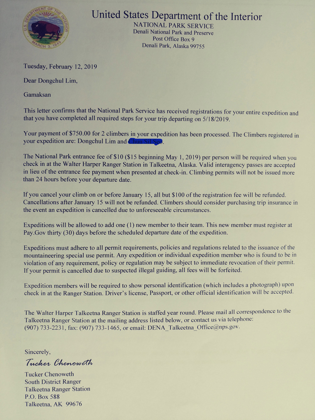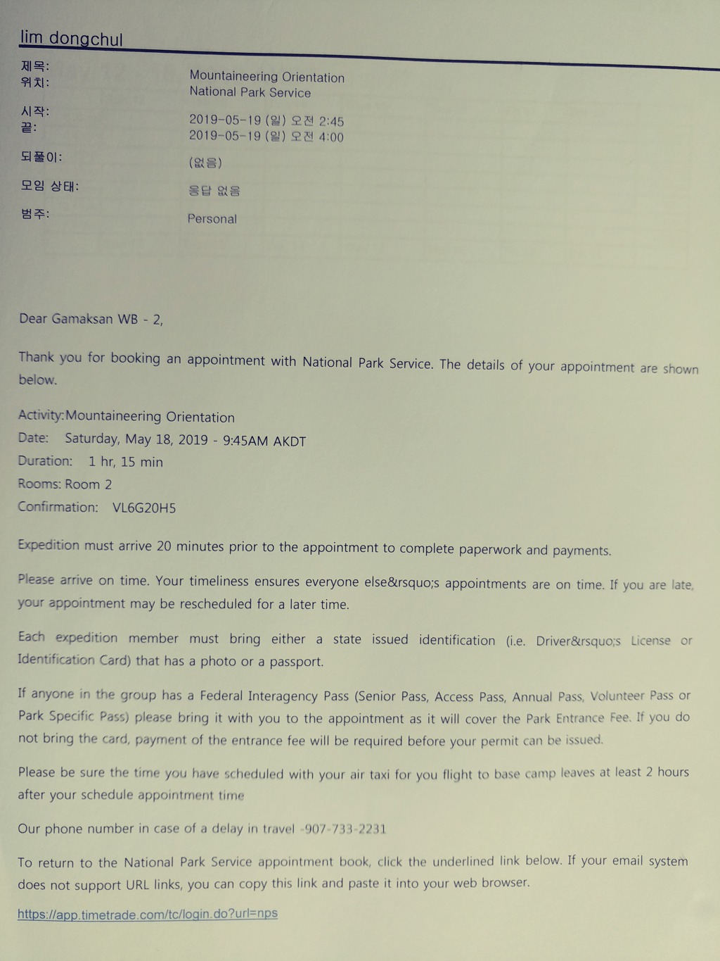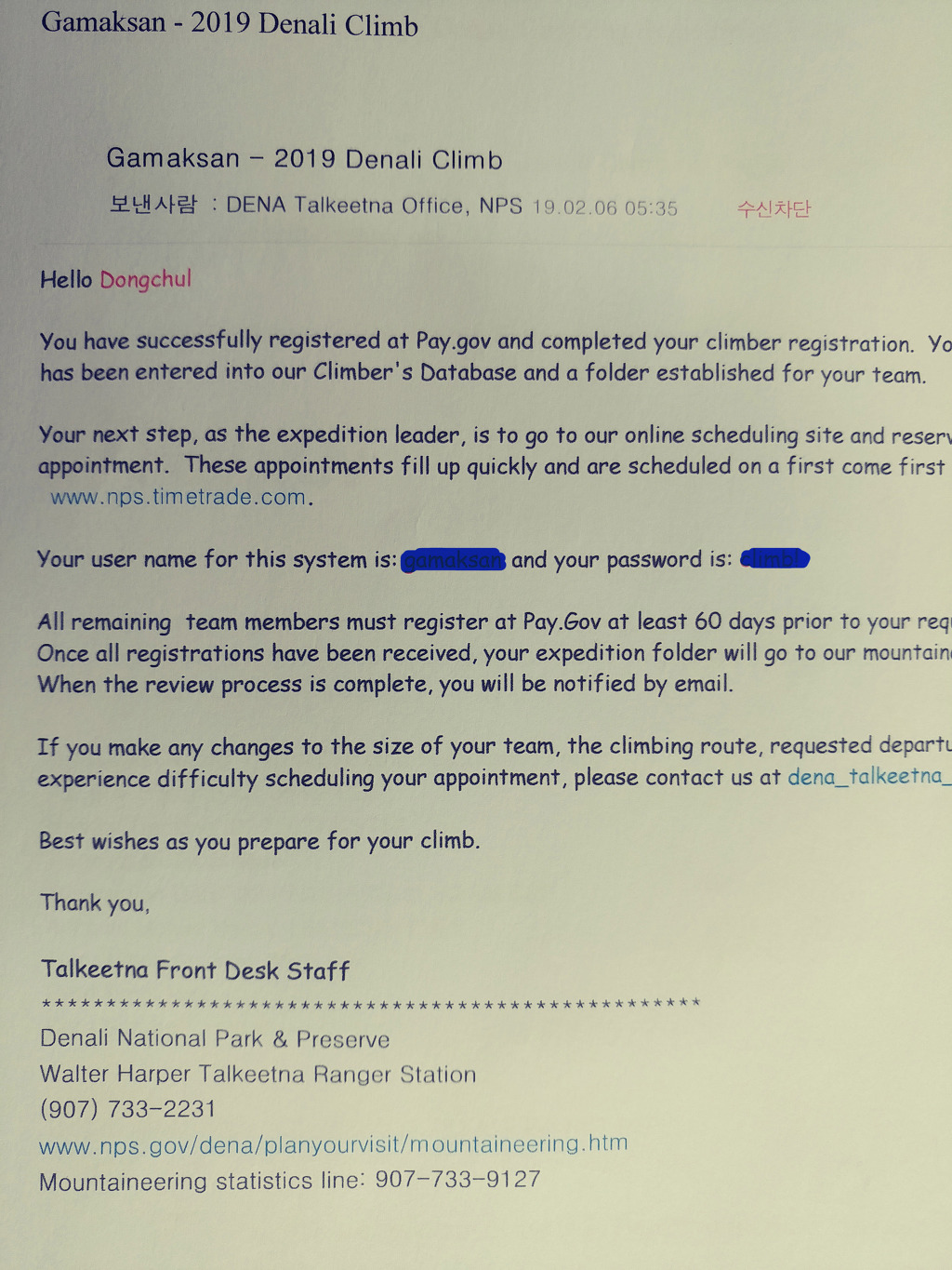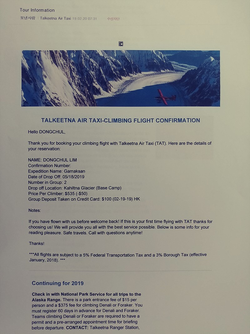 이것으로 데날리 등정신청은 전부 끝났다.
