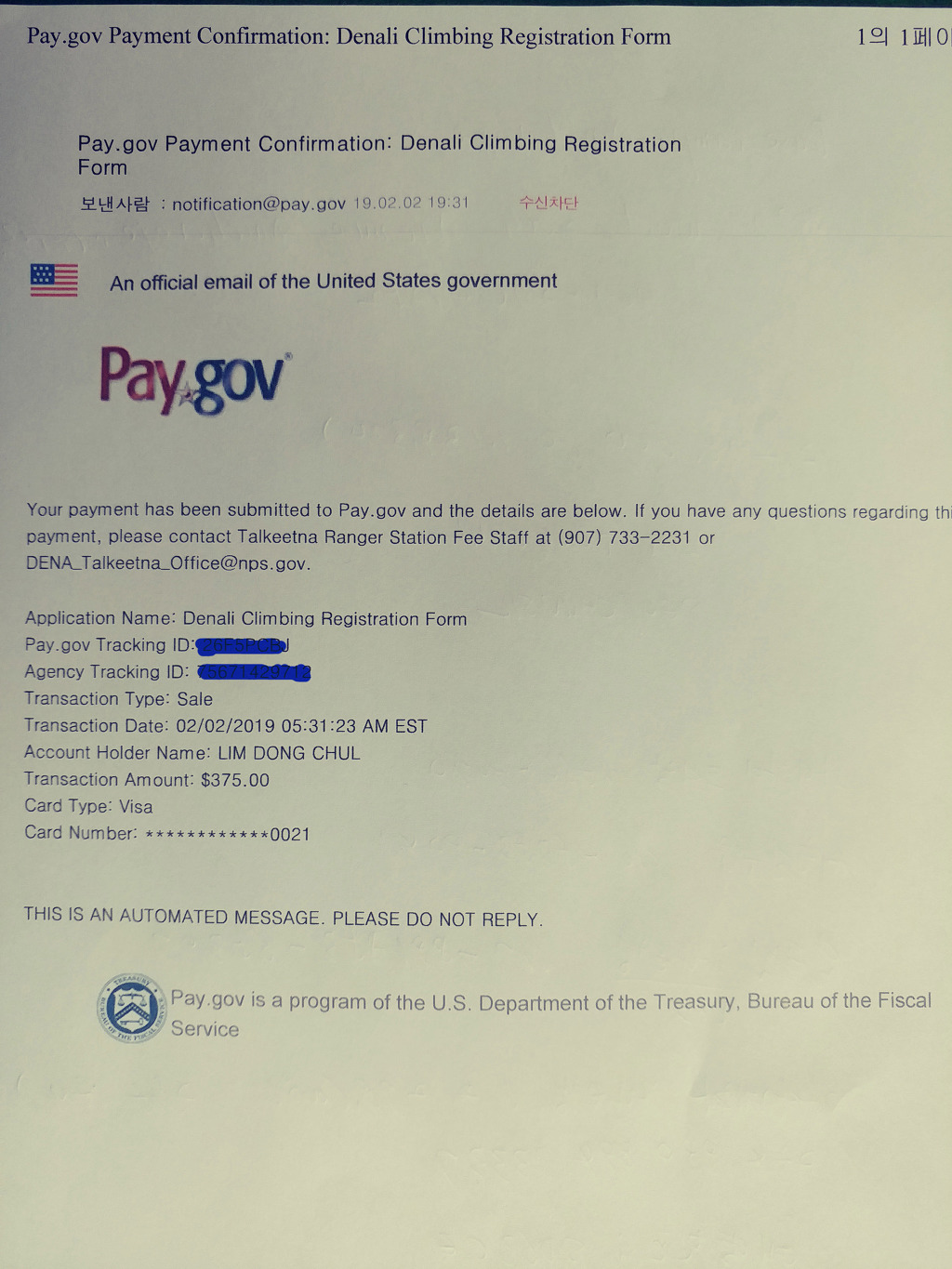 입산료는 미국정부에 지불한 것이기 때문에 미국 정부에서 상기와 같은 공식 문서가 온다....