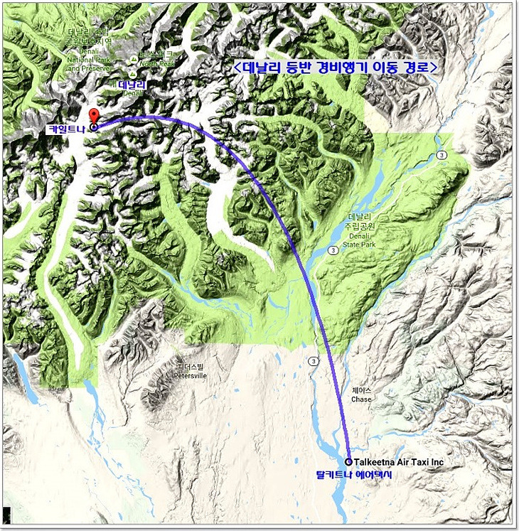 앵커리지에서 데날리 국립공원사무소와 경비행기가 있는 탈키트나까지는 180 km 정도 되는데,
