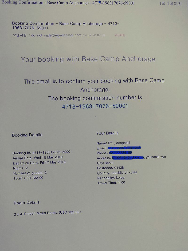 호스텔 예약 확인증,