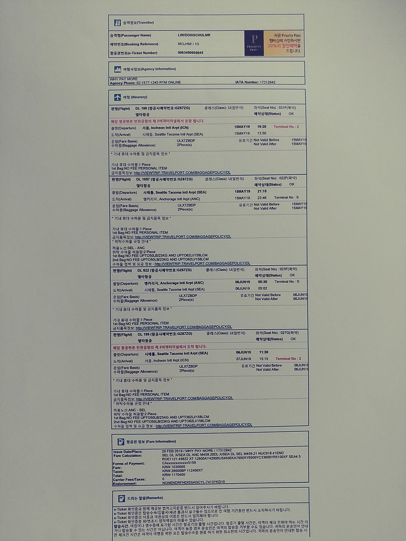 한국에서 앵커리지 왕복 비행기표 예약하여야 하는데,