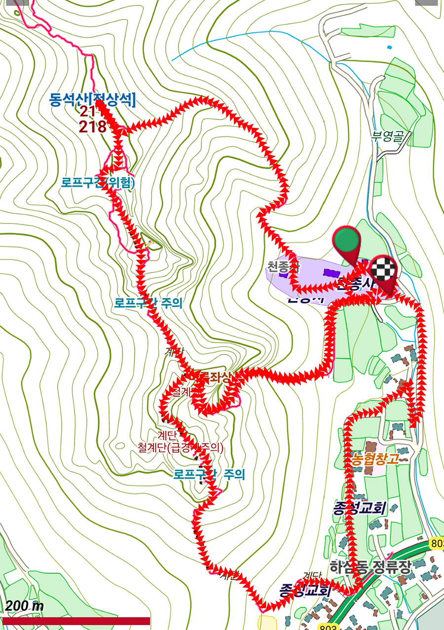 동석산 산행을 가볍게(?) 하려면 종성교회에서 시작하여 그 북릉을 타고 정상에 올랐다가 동릉을 내려 천종사로