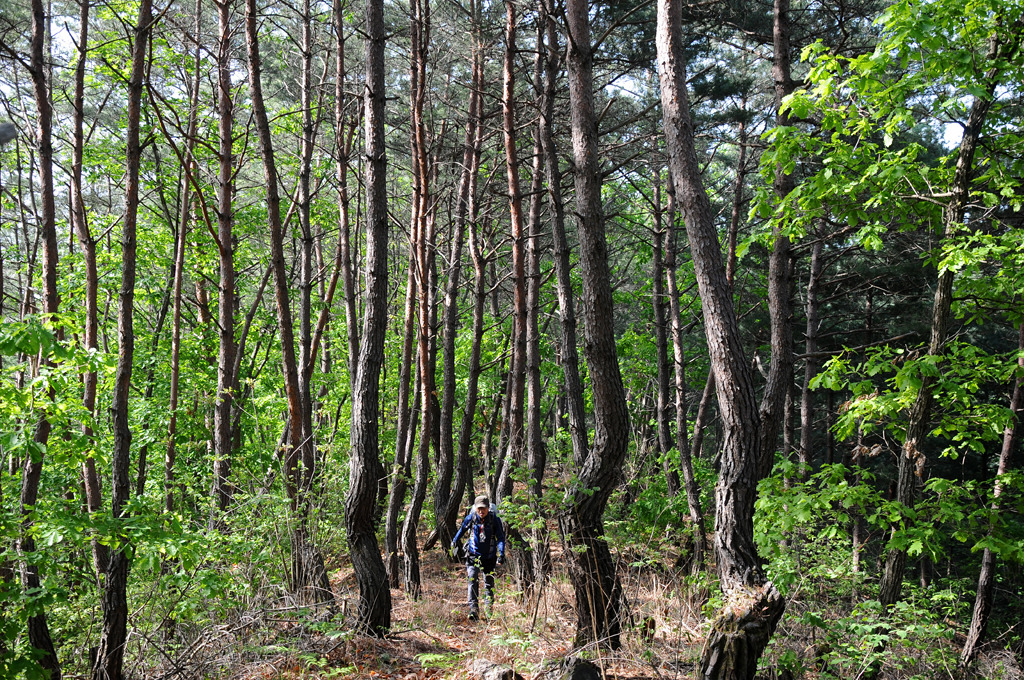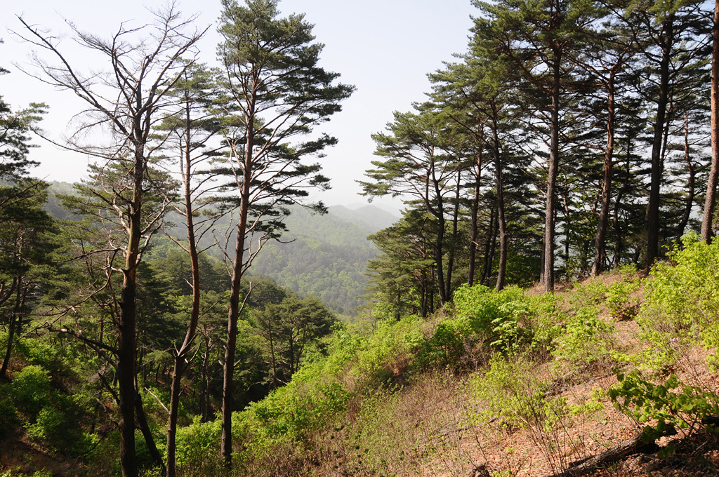 바라보았으나 황사로 뿌옇다. 북사면 빽빽한 잡목 헤쳐 907m봉 동릉에 들어서니 군인의 길
