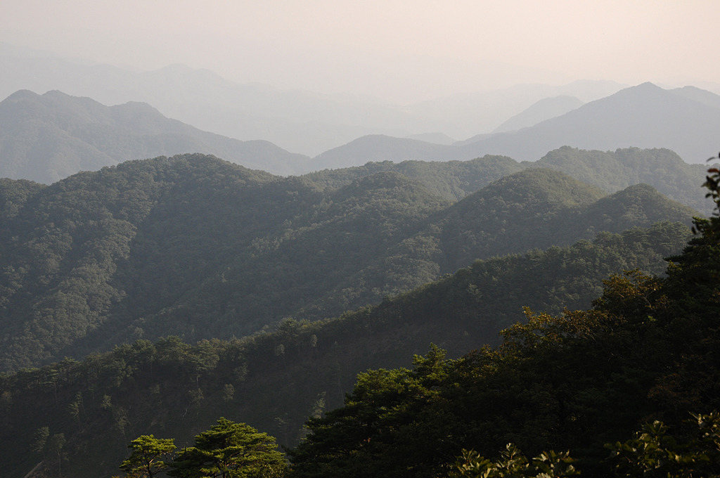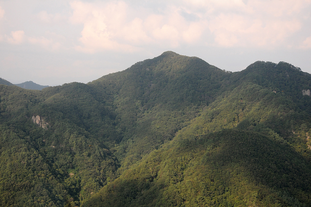 목 숲 헤치고 북쪽 절벽에 다가가면 발교산과 대학산, 공작산 연릉이 거침없이 보인다.