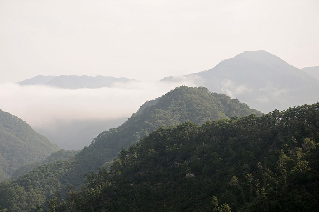 산준봉이 운무에 둘러싸였다. 금계천 건너 만대산, 응곡산, 덕구산으로 이어지는 한강기맥은