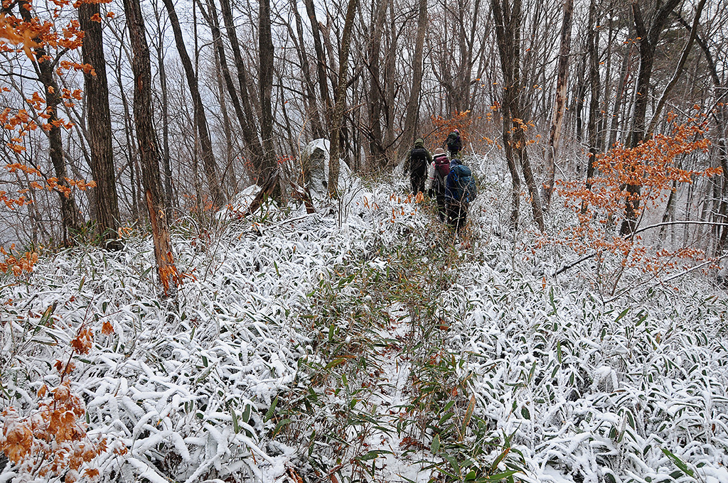 아쉽다. 일행들은 산죽지대 사면을 누비며 지나갔다. 그들이 잘못 간 길을 나 또한 그렇게 간