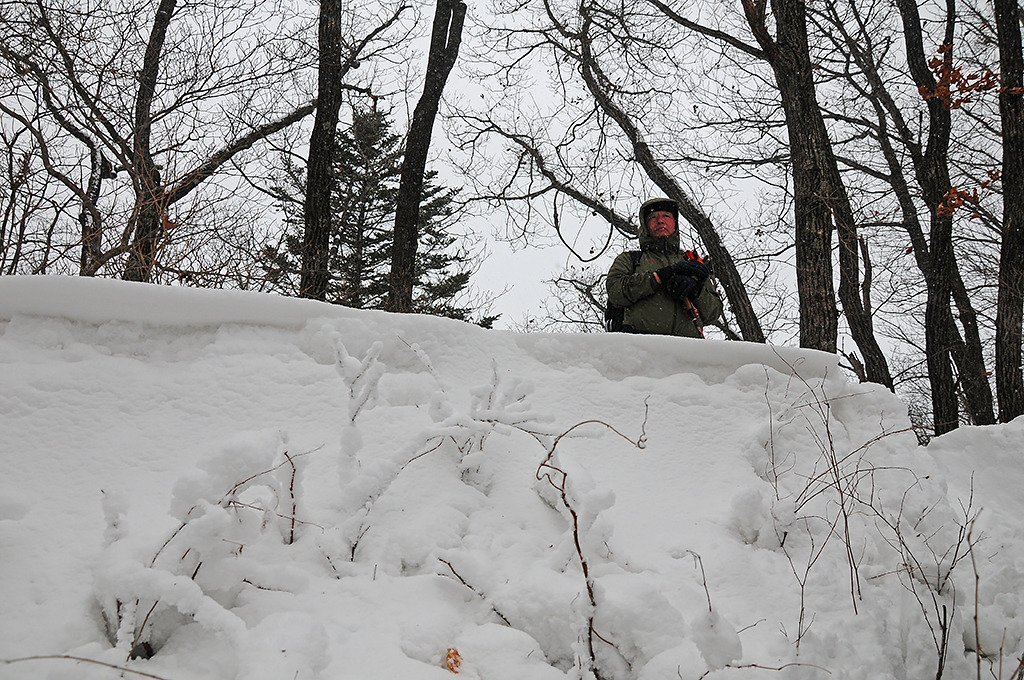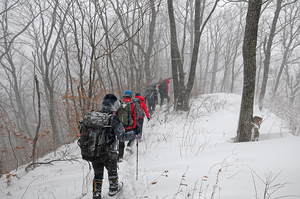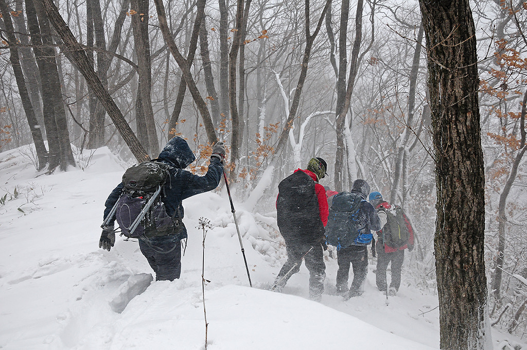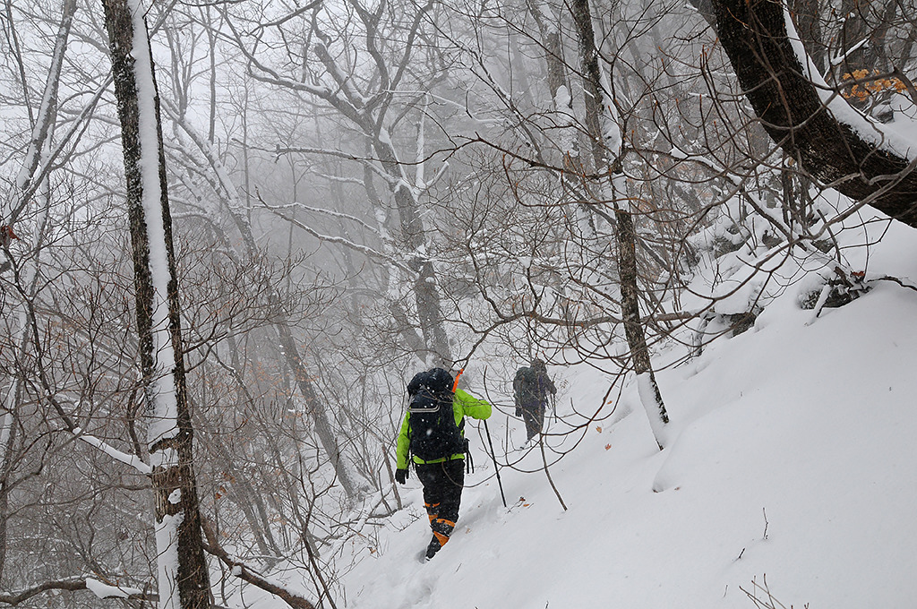 북진! 눈보라를 뚫고 나아간다. 능선 마루금에는 무릎 넘게 눈이 몰려 있어 자주 사면으로 비