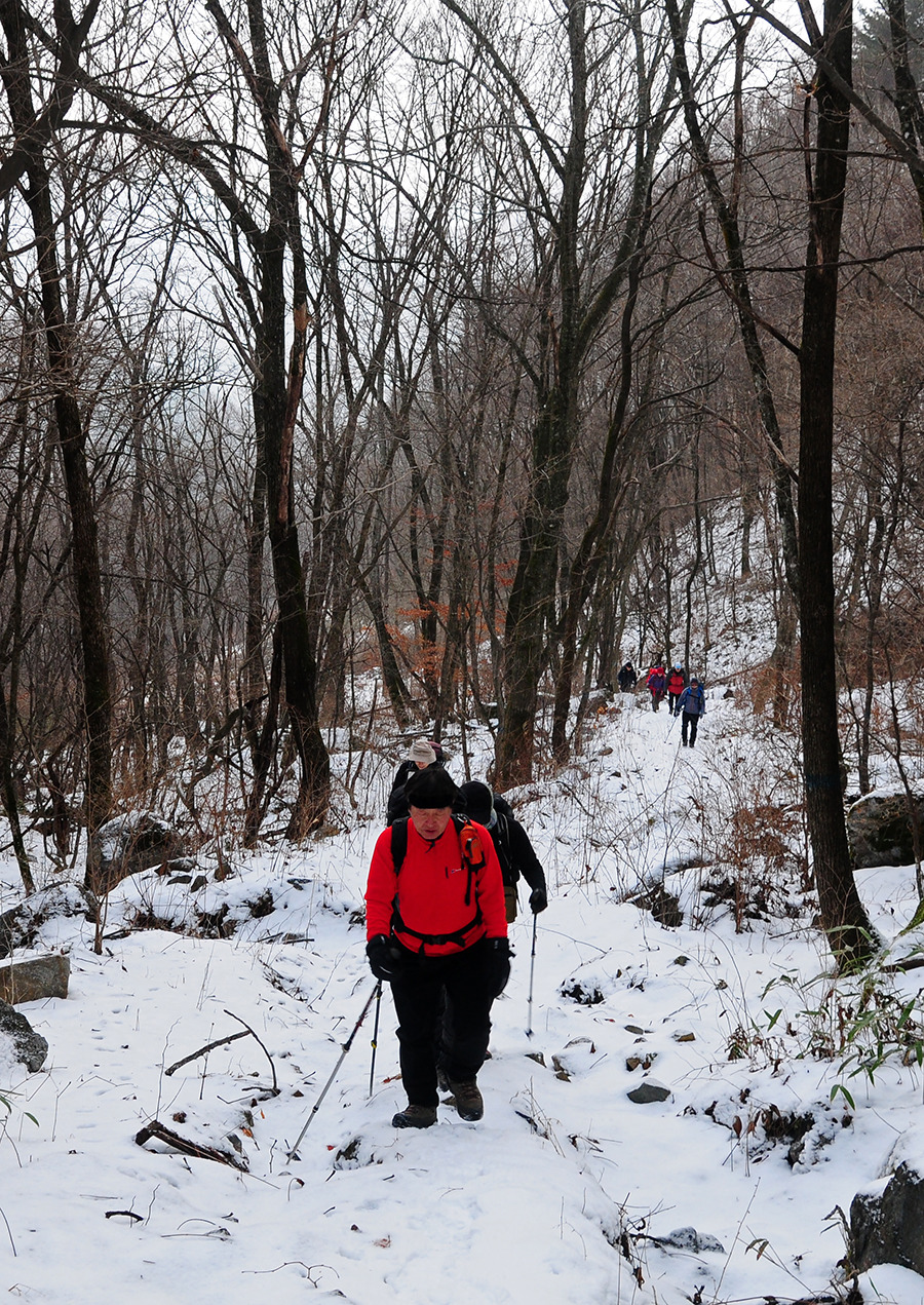 그 북사면이 만년설산이다. 백성골 주등로의 인적은 눈으로 푹 가렸고 우리가 새길 낸다. 가