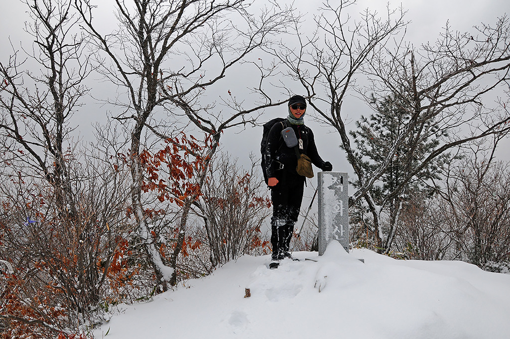 50m 더 가면 정상이다. 500m처럼 간다. 눈밭에 ‘석화산’이라 새긴 정상 표지석이 오도카니