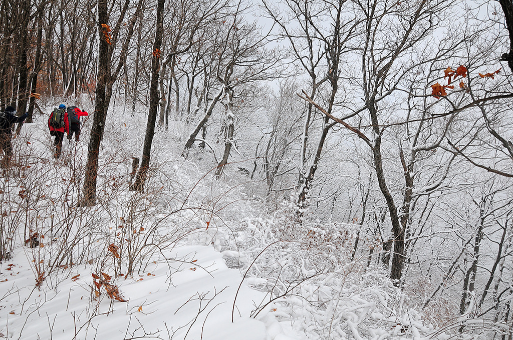 썩은 눈이 아니라 어제 내린 눈이라서 헤쳐 나가기 어렵지 않다. 주릉 갈림길에 올라서고