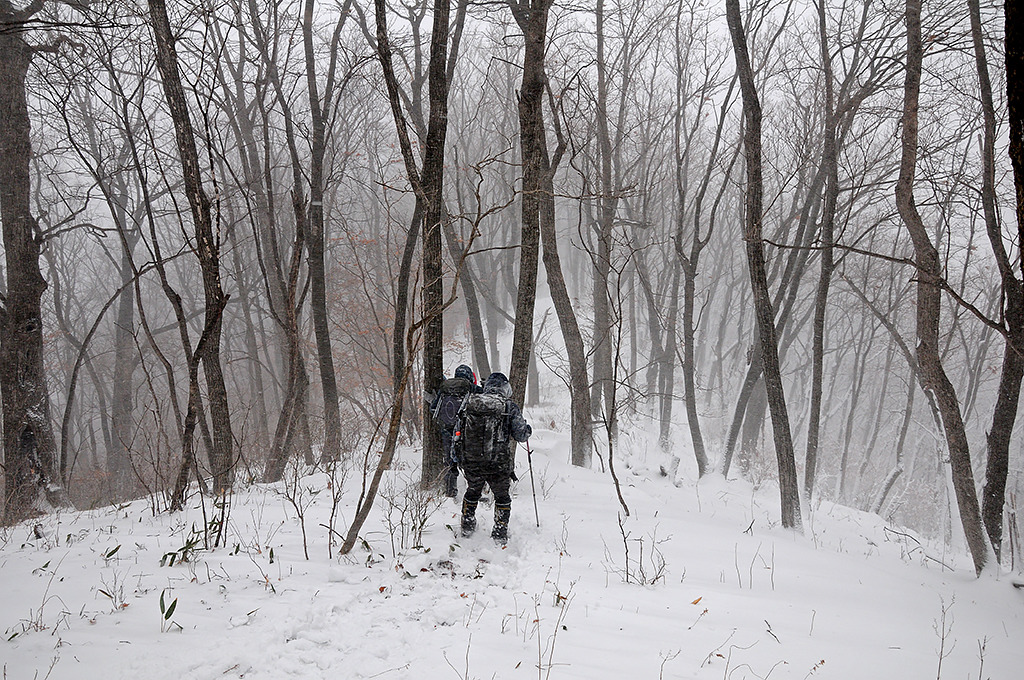 중봉 넘고 눈보라는 다시 기세를 회복한다. 눈보라는 가루눈이었다가 싸락눈이었다가 함박