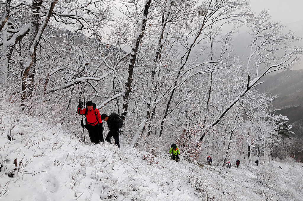 능선마루는 바람이 눈을 쓸어 모아서 깊다. 절반쯤의 오르막은 완만하다가 고정밧줄 나오고