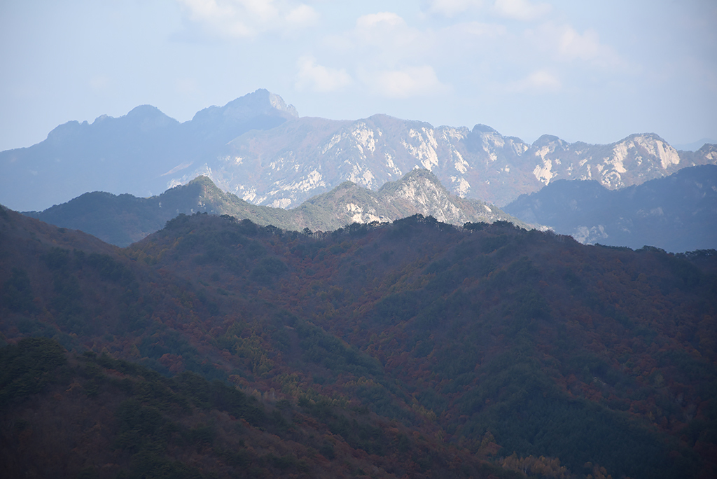 19. 멀리 가운데는 월악산, 그 앞은 마역봉 연릉, 그 앞은 깃대봉(치마바위봉)