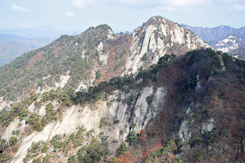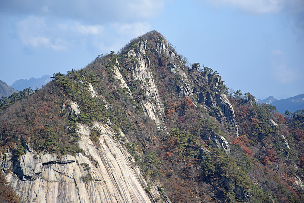 쳐다보는 이 산 모양새에 일단 기가 꺾였을 것이다. 등 뒤로 기라성 같은 봉우리들을 줄줄이 넘어세우고 그 앞