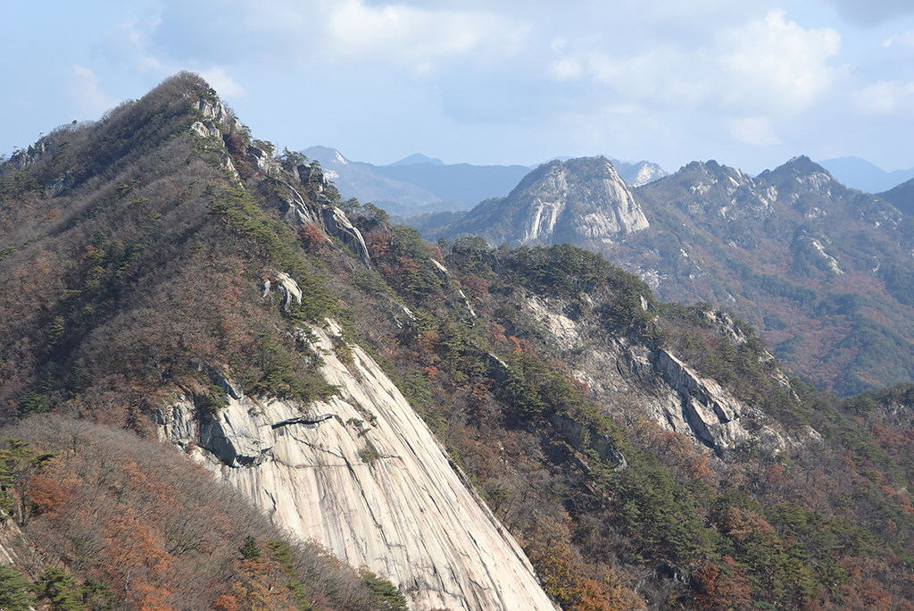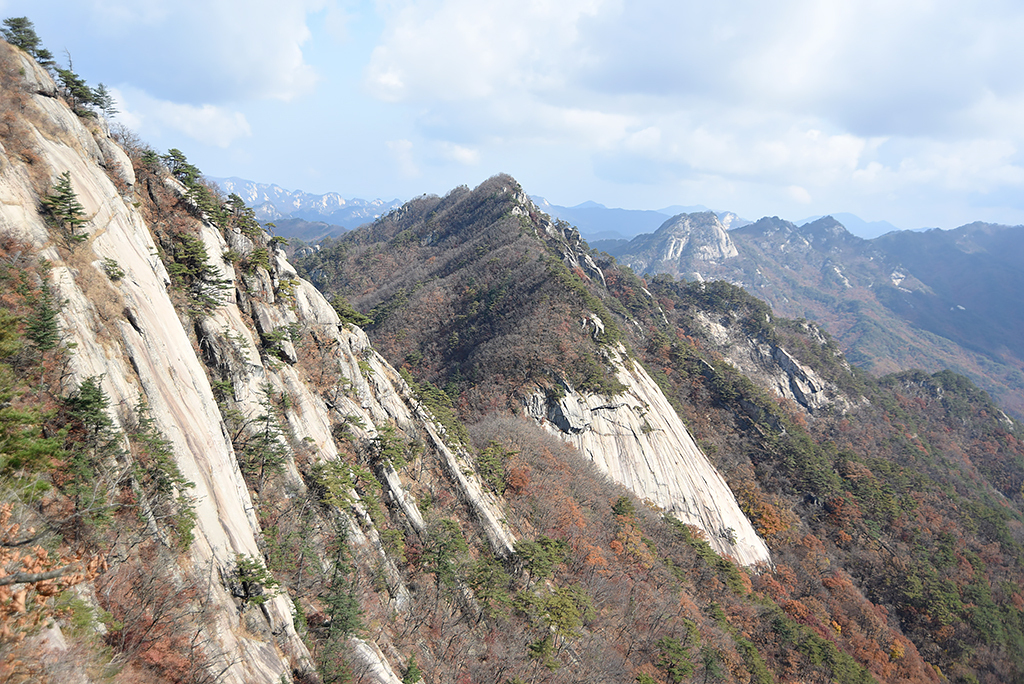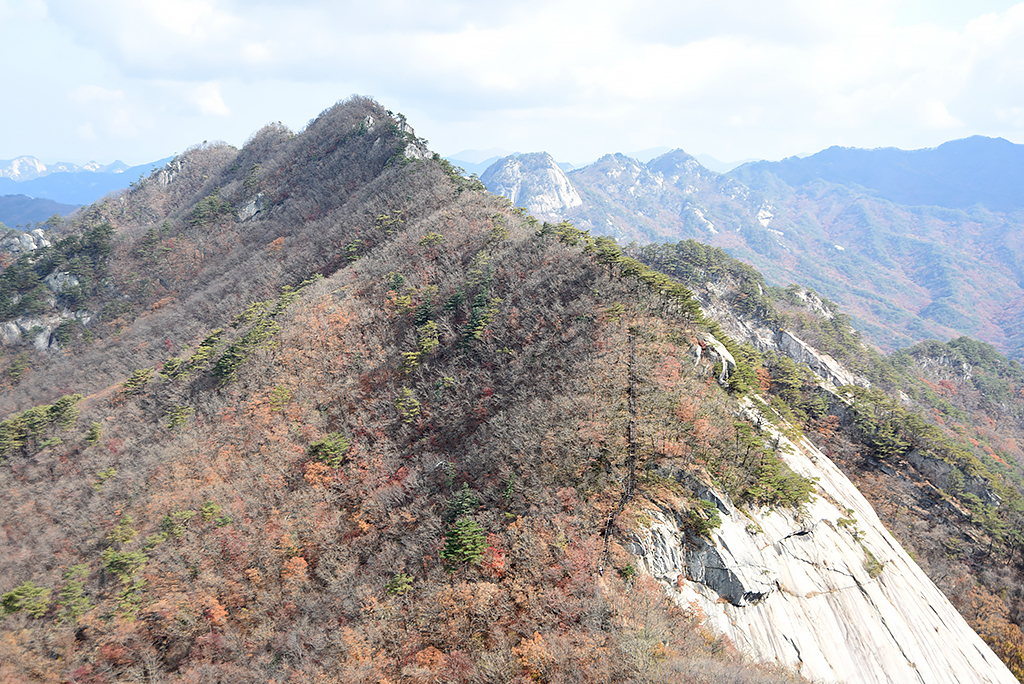 게 인적이 뜸하다. 암릉 오르내린다. 밧줄이 달려있다. 가파른 반침니도 오른다. 고도감이 있어 트래버스 할 때