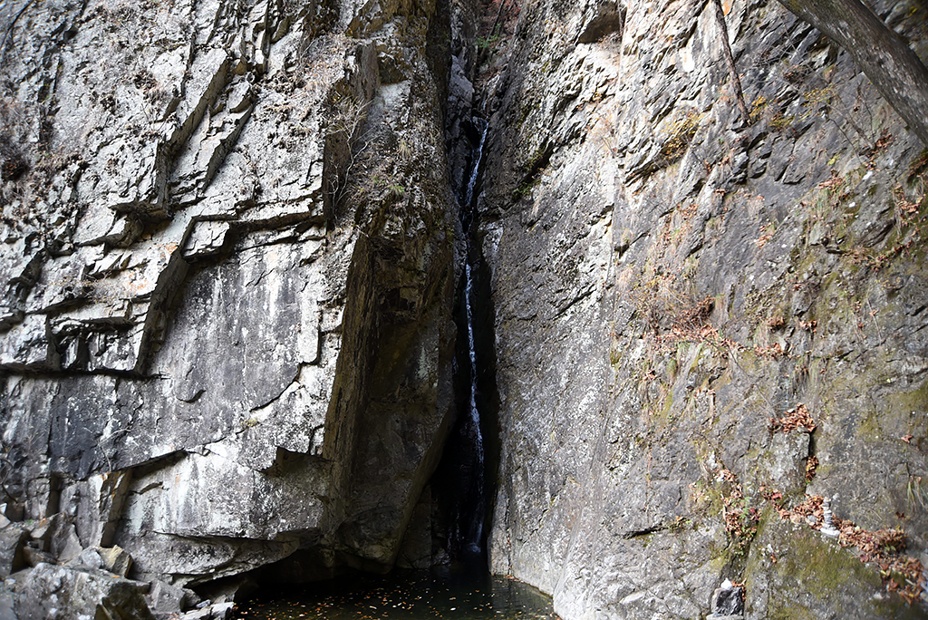 여궁폭포가 나온다. 가을 갈수기라 물줄기가 가늘다. 여궁폭포에서 계곡 왼쪽으로 내리는 길이 아주 잘났다.